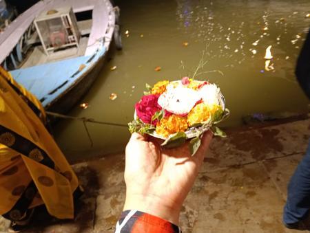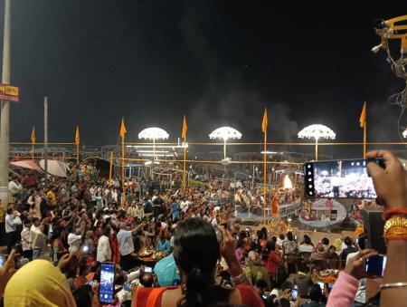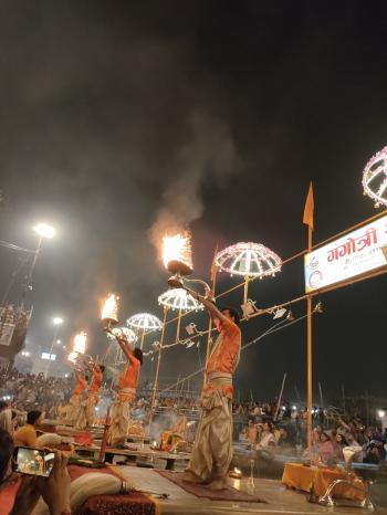 今回、バラナシで3泊しました。到着日の夜は、一日だけガイドを依頼した、バラナシ在住あきこさんが用意してくれた一番前のがぶりつきの席で、プージャ鑑賞。