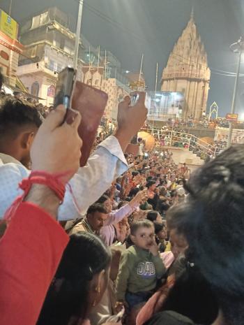 せっかくだから、もう一度プージャを見ておきたいと、初日と同じ、ダシャーシュワメード・ガートへ行ってみると、すごい人だかり。初日は一番前だったので、こんなになっていたとはと驚きながら、後ろから全体を眺められる、ちょうどいい場所に陣取ることができ、もういいと思ったら途中退場しようと気楽な気分で、そこで見始めた。