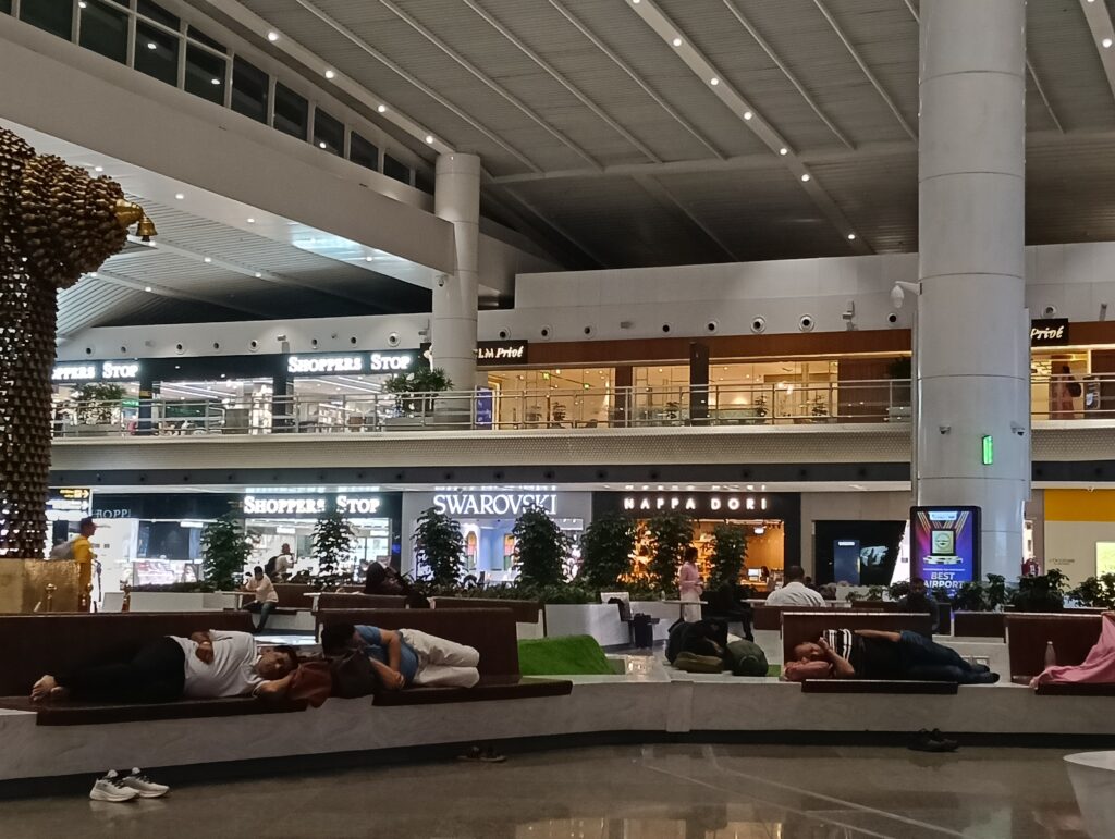 行き来する人は、ほぼインド人、たまに白人、を観察。服装は、男女ともほぼほぼ足首まで隠すスタイル。欧米人は短パン多いけど、インド人はクロップドパンツとかじゃなく、とにかく足首まで隠れているズボンかスカートの人が99%以上でした。この日は土曜日だったからなのか、ご家族連れも多かった。移動って狭いところにずっといて疲れるから、この広々空間でゆっくりできてちょうどよかったです。この横になれるベンチは結構ありました。みんなずっと寝ているわけではないから、最初塞がっていてもそのうち空くと思います。私がいた午前5〜7時あたりはどこかしら席が空いていました。